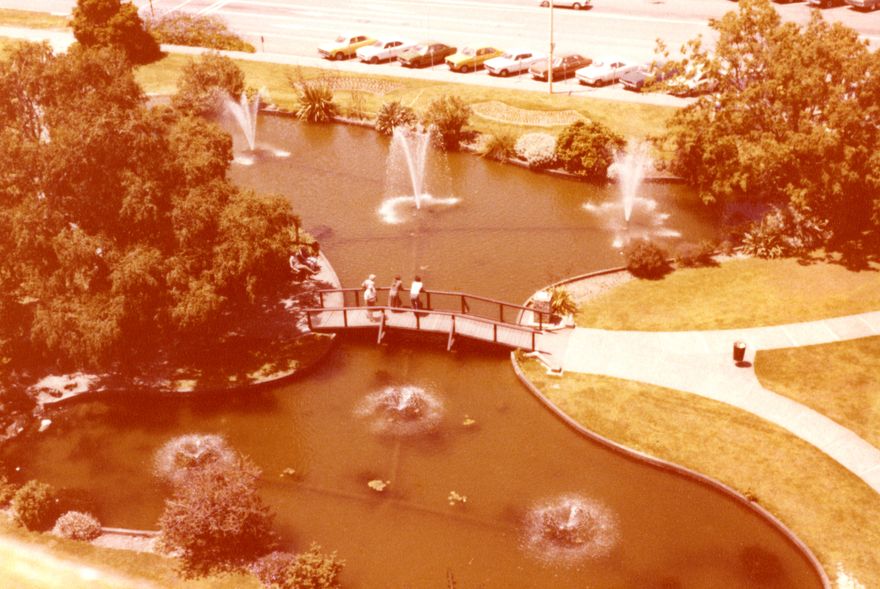 A photograph from the newly constructed Civic Administration Building. The Butterly lakelet was constructed in 1909 by the Beautification Society. The fountains were a later addition in the 1960s.