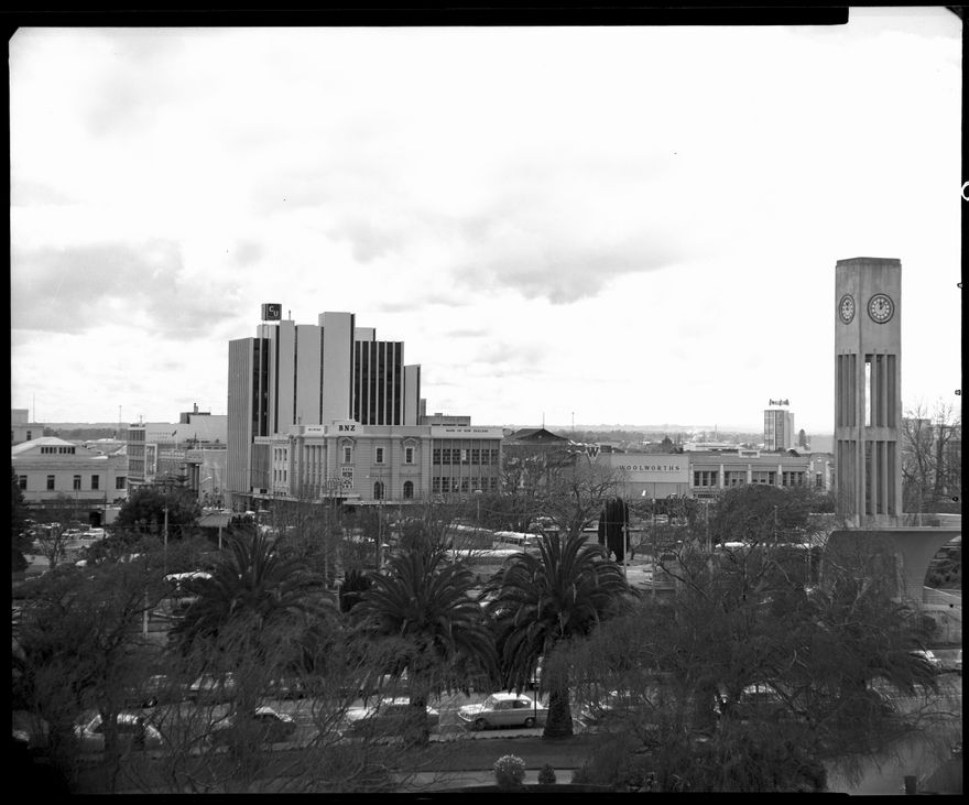 This photograph of The Square was taken in the vicinity of the Manawatu Standard building. In the foreground is the Lakelet (or Butterfly Lake), followed by the Phoenix Palms that once lived in The Square. The tall building towards the left centre is the The Commercial Union Building, situated on the corner of Rangitikei and King Streets. It was completed in March 1973. In front of this is the former Bank of New Zealand. It was demolished for a new multi-storey BNZ. The Hopwood Clock Tower, built in 1956 is visible on the right side of the photograph.