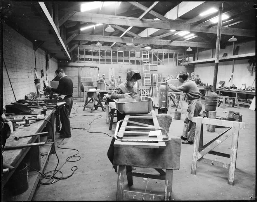 This image was taken for a story that ran in The Manawatu Evening Standard on 11 July, 1959. "In a section of the stainless steel department shown above, there is ample evidence of the space available for laying out jobs and working unhindered. All guillotines, presses, folding machines and machinery are concentrated in one section of the department to avoid time loss and give maximum efficiency. The welding section is separately housed and all welding processes are carried out with the very latest argon-arc welding plant which does not make a joint as commonly believed, but actually fuses the two sections into one common metal. The front half of this wing of the factory is used exclusively for the fitting of frames, packing and despatch."