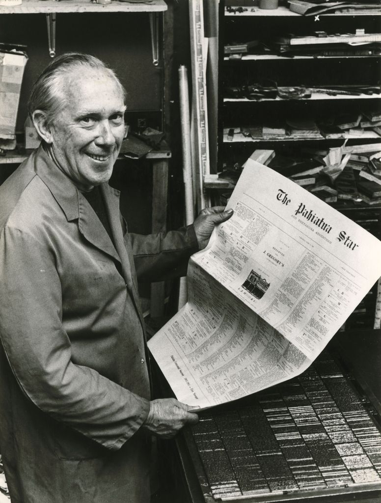 - Cyril Carle holds a facsimile copy of Pahiatua’s first newspaper at the time of the Pahiatua centennial celebrations from February 28 – March 7, 1981. The Pahiatua Star and Eketahuna Advertiser was published twice weekly from 1886 to 1893.He is holding Volume 2, Issue 1 from June 11. The year is illegible.