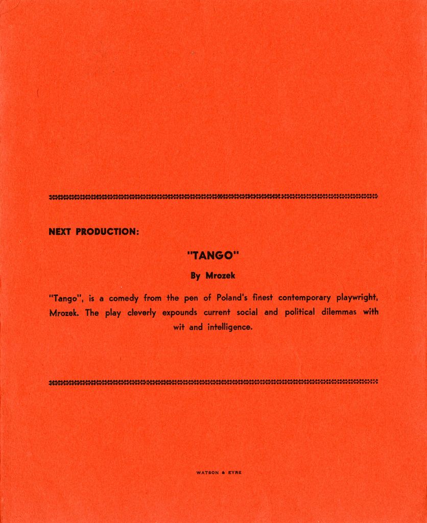 This play was written by Rene de Obaldia and performed at Centrepoint Theatre in 1974 and 1978. This production was directed by Donald Hampton.