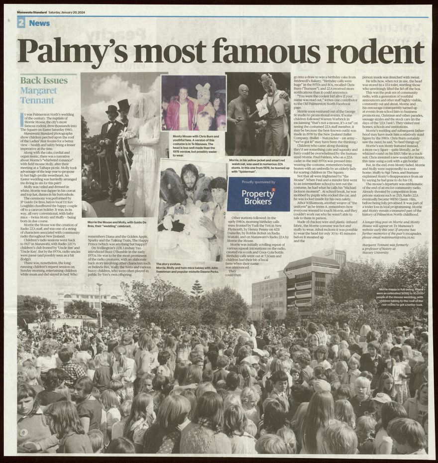 Local historians weekly "Back Issues" article in the Manawatū Standard. In the late 1970s, Radio 2ZA staff created costumed character Morrie the Mouse and family. Initially the voice of a children's radio programme, the costumed human sized mouse went on to do promotional work and entertainment in the city. By the 1980s, Morrie the Mouse was very popular. He was taken to visit schools, rest homes and hospitals, and appeared at business promotions, gala days and fairs.