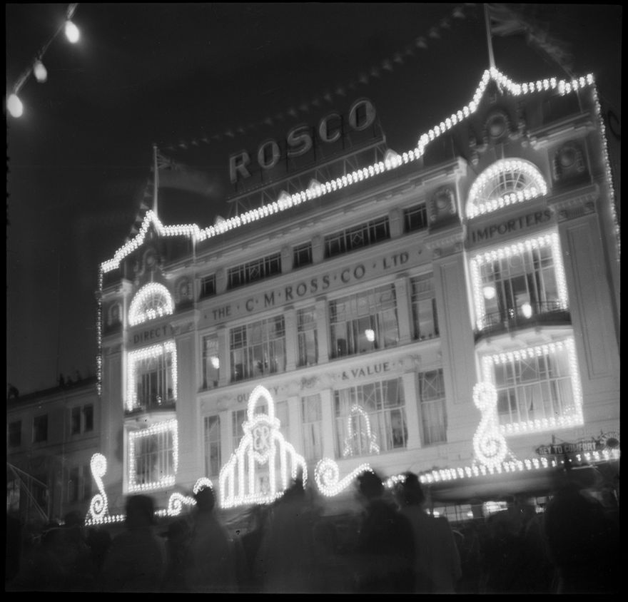The decorative lighting on the C M Ross & Company Ltd (Roscos) building suggests this photograph dates from either the celebrations for the Coronation of Queen Elizabeth II in June 1953, or from the Royal Visit of the Queen and Duke of Edinburgh in January 1954.