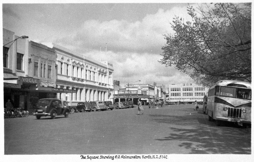 The white building on the corner of Main Street East and The Square is the Post Office (the clock tower was removed after an earthquake in 1941). Directly in front is the PDC (Premiere Drapery Company, now the Plaza).
