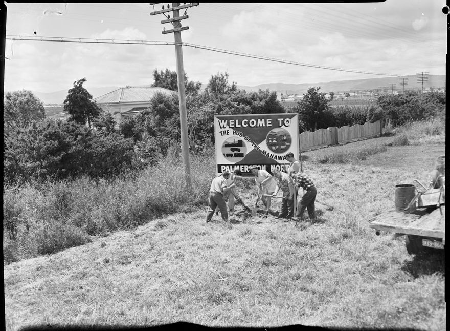 This image was taken for a story that ran in The Manawatu Evening Standard on 21 December, 1959. “Yesterday the members of the Palmerston North Jaycee erected large signs on three highways leading into Palmerston North. It is hoped to erect one at Fitzherbert shortly. The party is seen after erecting one of the signs.”