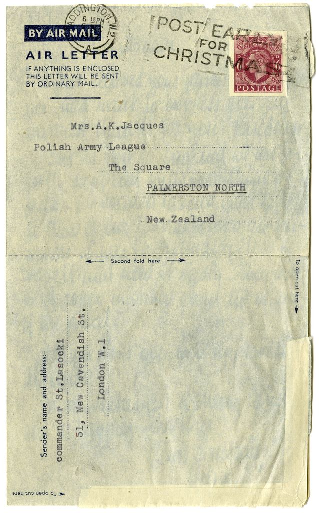 Letter (aerogramme) from Commander St. Lasocki to the Polish Army League, thanking them for parcels received, which they will forward to Polish prisoners of war in Germany. The Polish Army League, founded in Palmerston North in WWII, corresponded with and sent parcels to Polish soldiers who served with the allies in World War Two.