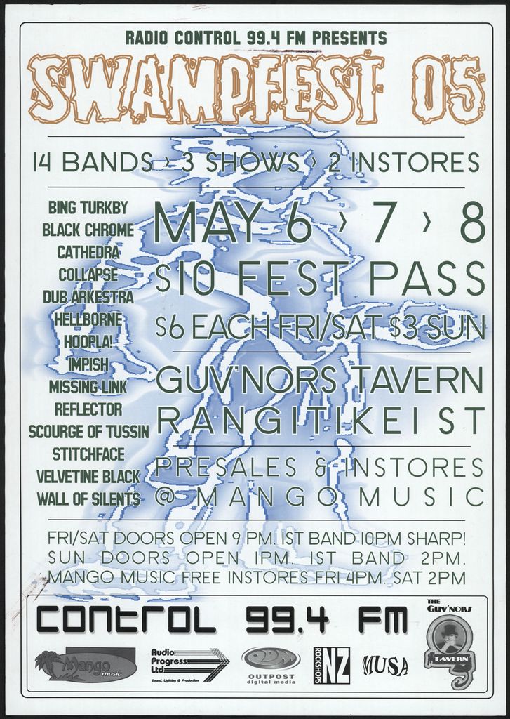 Radio control 99.4FM presents Swampfest 05. 14 bands 3 shows 2 instores. Bing Turkby, Black Chrome, Cathedra, Collapse, Dub Arkestra, Hellborne, Hoopla!, Impish, Missing Link, Reflector, Scourge of Tussin, Stitchface, Velvetine Black, Wall of Silents. May 6, 7, 8. $10 fest pass. $6 each Fri/Sat. $3 Sun. Guv'nors Tavern Rangitikei St. Presales & instores @mango music. Fri/Sat doors open 9pm. 1st band 10 pm sharp! Sun doors open 1pm. ist band 2pm. Mango Music free instores Fri 4pm. Sat 2pm.