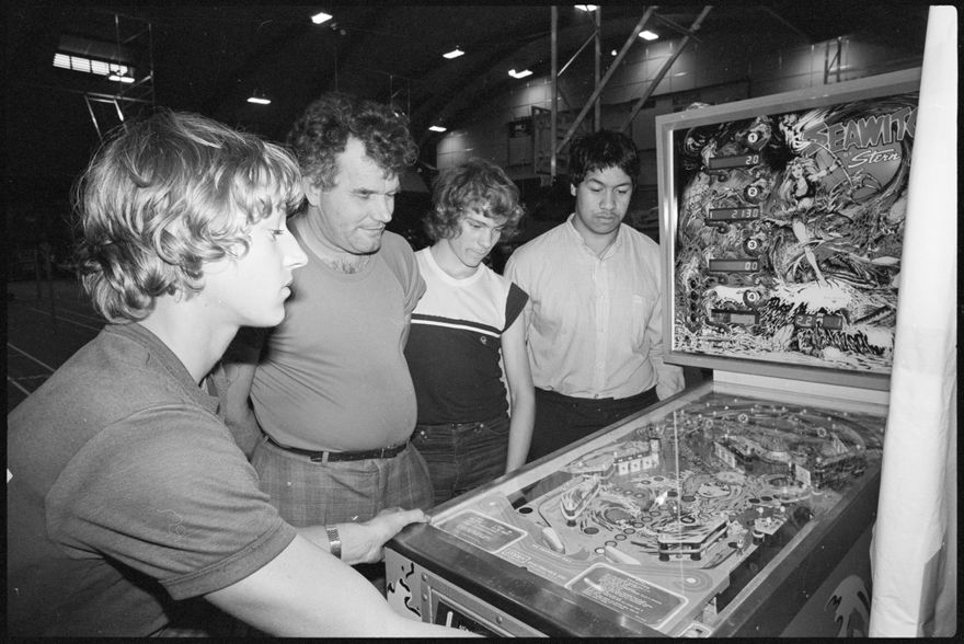 This image was taken (but not used) for a story that ran in The Manawatu Evening Standard on Monday 29th June 1981. The 'Seawitch' pinball machine was manufactured by Stern in 1980. It featured flippers, pop bumpers, slingshots, stand-up targets, rollovers, drop targets and a spinning target. Telethon 1981 was for the International Year of Disabled Persons. Telethon was a 24-hour live television spectacular designed to raise money for charitable causes. It originated in the United States, but New Zealand put a typically Kiwi spin on the event. Local performers, amateur and professional were joined by international stars, who entertained New Zealand to raise money for charity. Groups of people from schools, clubs, and pubs, contributed cash and cheques, often in an oversized format, to add to the pledged totals on the day of the event.