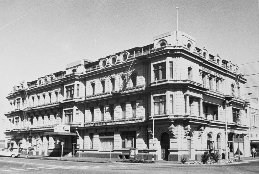The Grand hotel was constructed in 1906, with the original plans showing 66 bedrooms, 2 conservatories, one shop facing the square and a large dining room. It was designed by NZ architect Mr Maddison and built by Mr James Trevor (Trevor Bros). The tower was later removed as an earthquake risk. The Duke and Duchess of York stayed during their 1927 tour of NZ as did Queen Elizabeth II during her 1952 tour. It is now largely used as business offices, with a bar and cafe on the Ground Floor. It is listed in category 2 of the New Zealand Historic Places Trust register because of its historic and community significance.