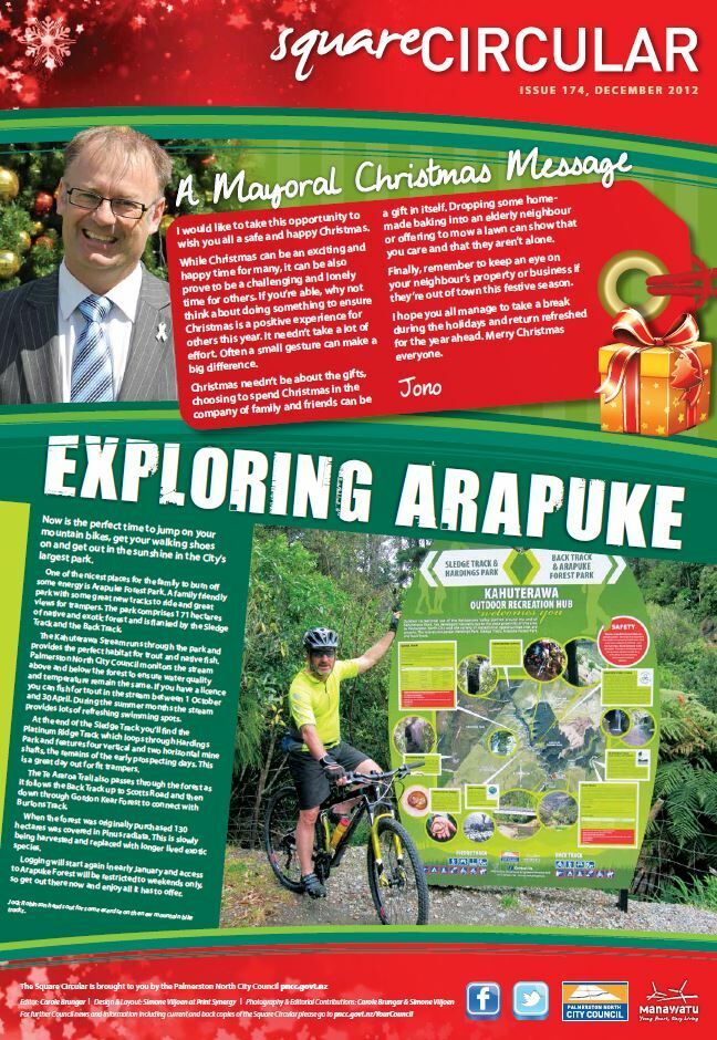 The Square Circular was Palmerston North City Council's monthly community publication, informing Palmerstonians of PNCC initiatives, activites, and events. This month's issue includes: Arapuke; Parking; Charities; Cycling; Sustainability; Ashhurst Library; Pet Safety; Recycling; Santa Cave; Civil Defence; Recycling.