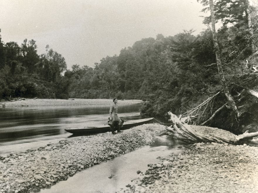 Member of survey party with canoe. The Otaki River originates in the Tararua Range and flows for 45 km, firstly heading southwest through a valley in the Tararua Ranges. It turns northwest in the area of Otaki Forks, where it is joined by the Waiotauru River. After continuing through Otaki Gorge it reaches the Tasman Sea south of the settlement of Otaki Beach.