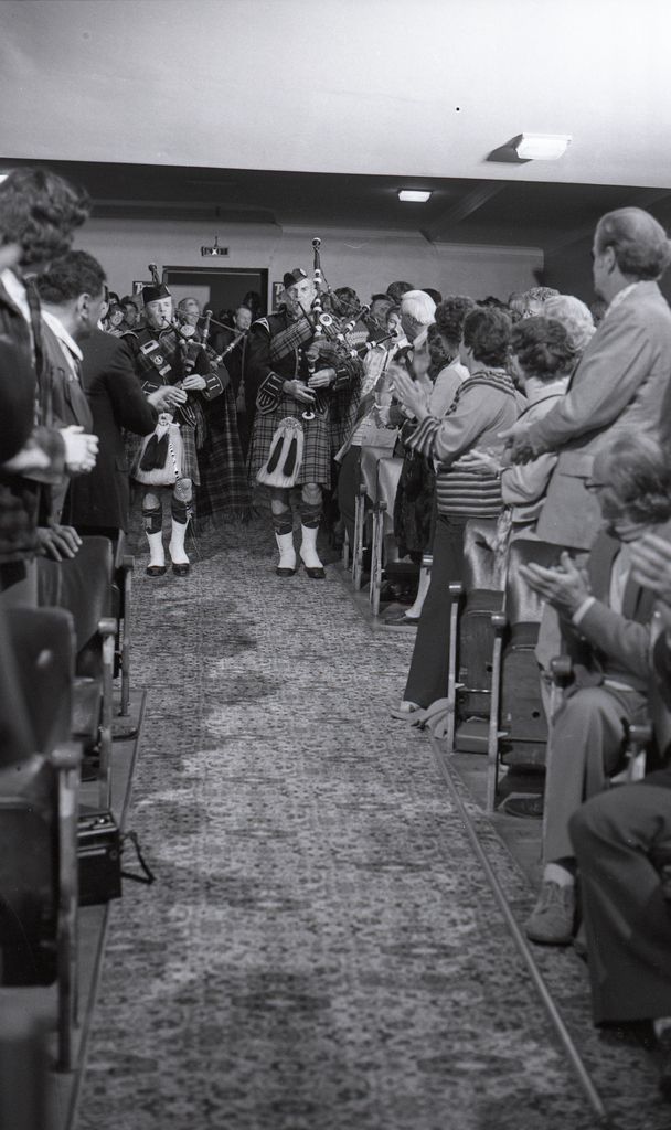 This image was taken (but not used) for a story that ran in The Manawatu Evening Standard on 1 November 1978 “Rowling in top form at opening” Labour leader Bill Rowling opened his general election campaign at Palmerston North’s Opera House with a rousing speech to over 1000 supporters on Tuesday 31 October. He was led through the Opera House aisle by two bagpipers, where he and his wife Glen shook hands with the crowd. The Standard reported that member of the public who could not secure a seat were taken to the Concert Chamber, where they watched the live broadcast of the event on television.
