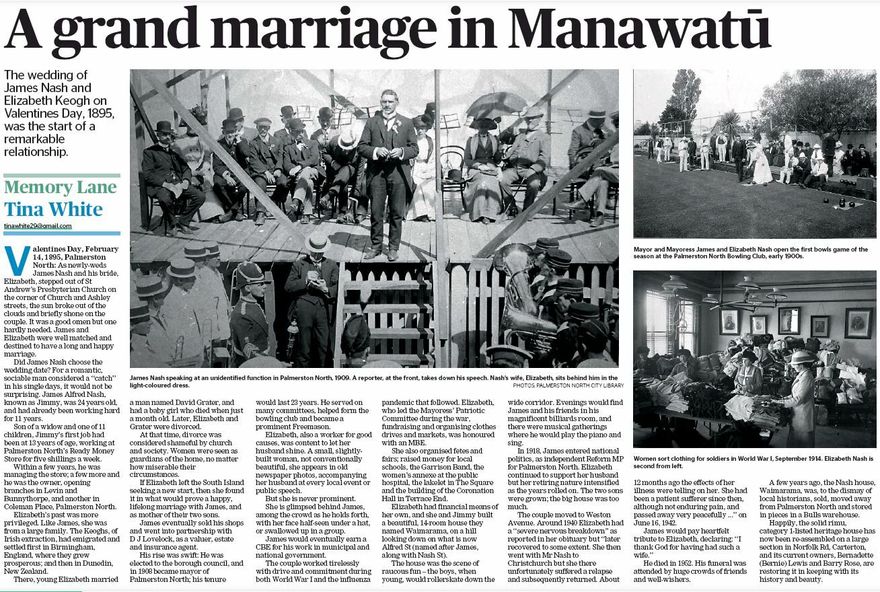 Journalist Tina White's weekly "Memory Lane" article in the Manawatū Standard. The life story of Minister of Parliament, mayor and councillor James (Jimmy) Nash and his wife Elizabeth (nee Keogh). They were married in 1895 and lived in Waimarama, a past homestead on Alfred Street.