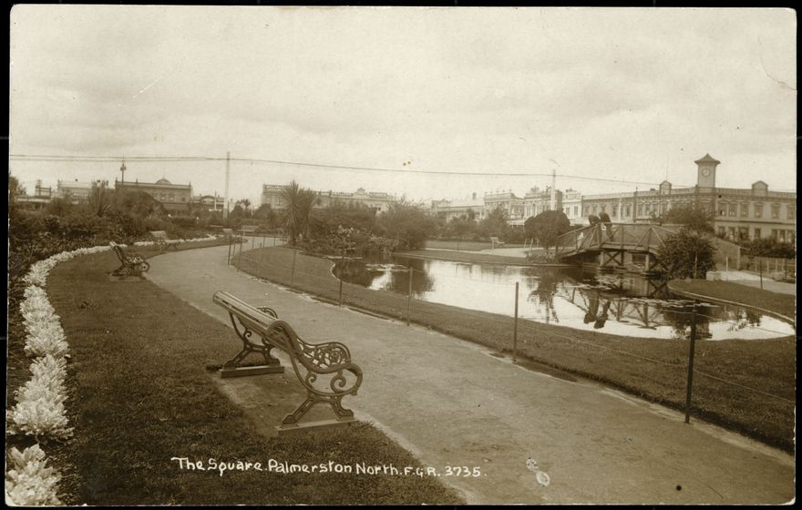 This postcard looks from The Lakelet towards the south-east section of The Square, between the corners of Main Street East and Fitzherbert Avenue.