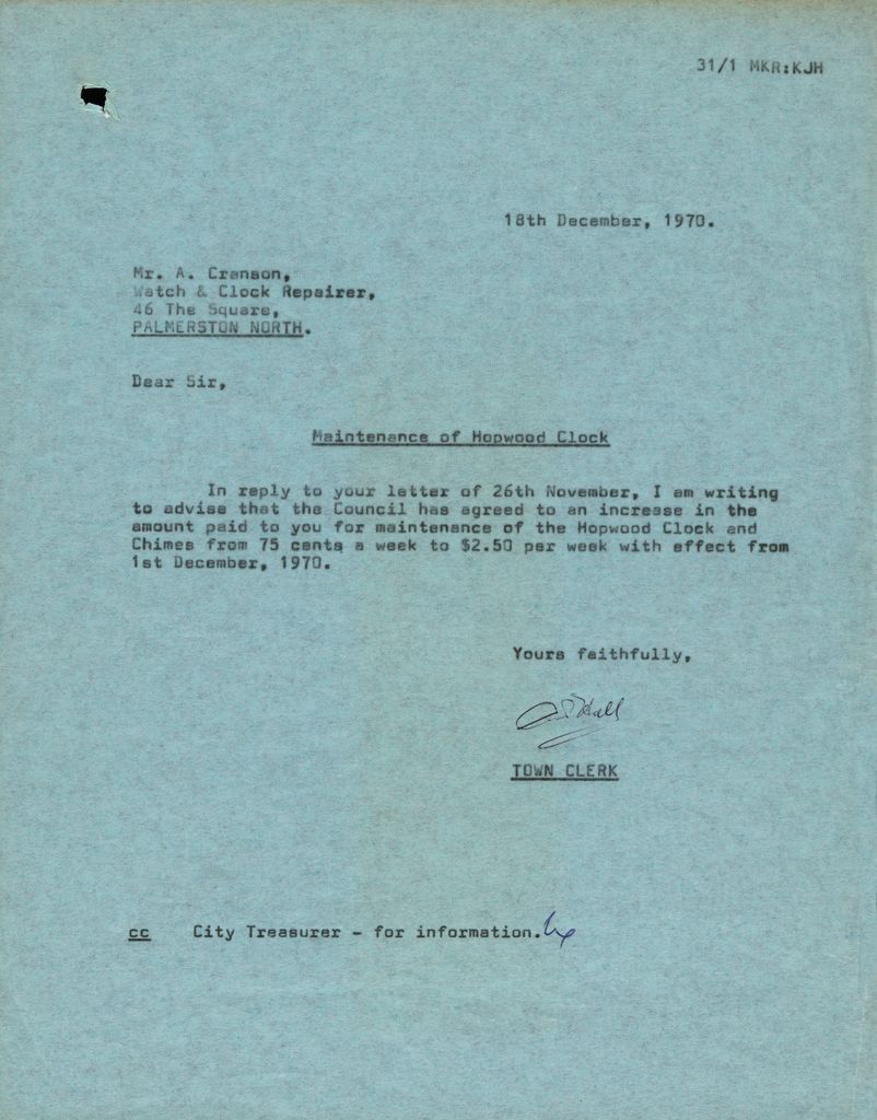 Mr A Cranson, watch and clock repairer of 46 The Square, maintained the town clock in the Clock Tower. In 1970 Peter Hall, Town Clerk for the Palmerston North City Council, wrote to confirm an increase of payment for maintenance from 75 cents to $2.50 per week.