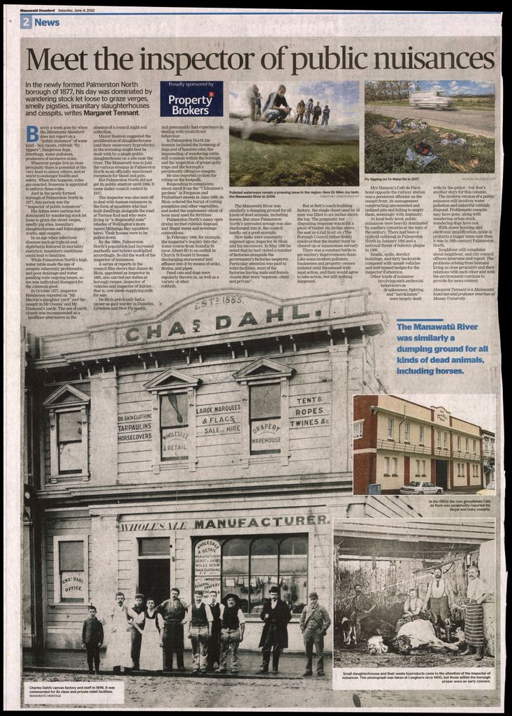 Local historians weekly "Back Issues" article in the Manawatū Standard. In the newly formed Palmerston North borough of 1877, public health conditions were of concern. The inspector of public nuisances's duties included dealing with complaints about wandering stock, smelly pig sties, insanitary slaughterhouses and fellmongery works, and cesspits. The importance of his duties was highlighted by a typhoid outbreak in Palmerston North in 1895 and the threat of bubonic plague in 1900.