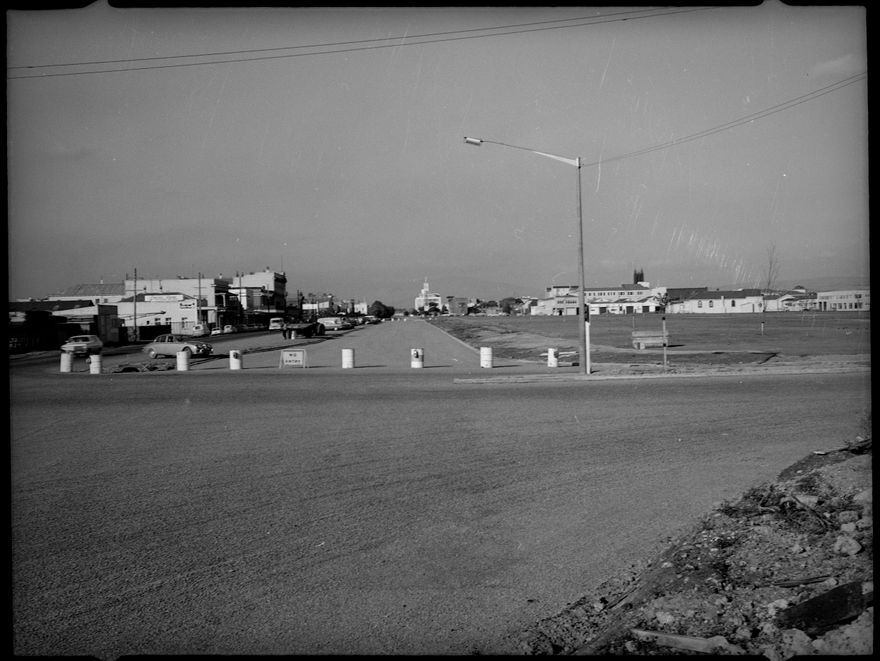 This photograph was taken on the corner of Cook Street and Main Street West, and looks towards and beyond The Square. On the left is the Railway Land Reserve. This land formerly held the Railway Station and yards, that were removed in 1964 when the deviation of the line to the edge of Palmerston North was finally completed.