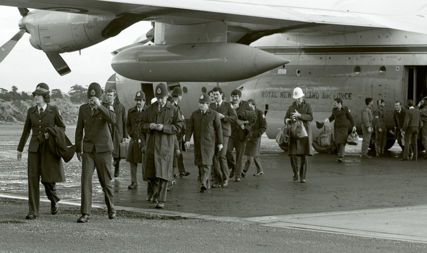 This image was taken (but not used) for a story that ran in The Manawatu Evening Standard on 01 August 1981. The Standard reported that as many as 1000 police were involved in planning for protests on game day, including the specially formed ‘Red and ‘Blue’’ riot squads. This image depicts the arrival of extra police via Airforce Hercules.