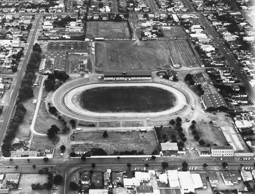 In 1886 the Government gifted 9.5 acres of land in Cuba Street to the Manawatu and West Coast Agricultural and Pastoral Association, and the first A&P show was held in that year. In 1973 the Grounds were transferred to the Palmerston North City Council and since then have been administered by a Trust. The photograph encompasses the block surrounded by Cuba (at bottom), Pascal (on left), Featherston(top) and Waldegrave Streets (right).