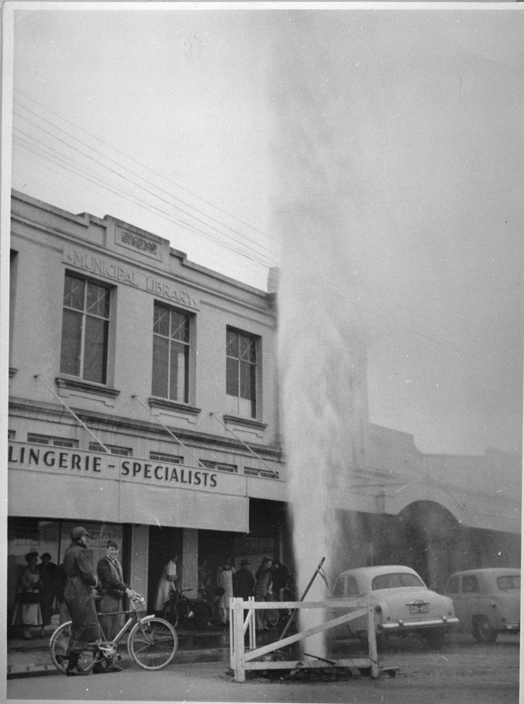 A burst water main on the street caused flooding in the Palmerston North Municipal Library. This library building was built by the City Council on the corner of Fitzherbert Avenue and The Square, on the site of the Occidental hotel which was destroyed by fire. It opened in 1929. The Library was originally housed upstairs and offices and shops occupied the Ground Floor. In the late 1950s the library expanded downstairs.