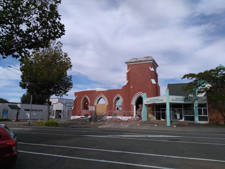 The Wesley Broadway Church was originally called St Paul's. It was designed by James Bennie in 1911 and was the third Methodist church on this site. In 1989 the two Methodist churches in Palmeston North (the other in Cuba Street) combined to become the Wesley Broadway Church. The church was demolished in 2020 as it did not meet the new earthquake standards. Photo taken on a Huawei GR5 mobile device.