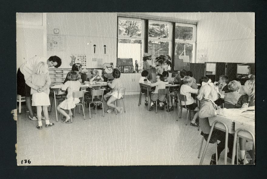 Miss Joy Whitehead, Infant Mistress, teaches about twenty pupils in the recently constructed junior classroom of Aokautere School. Aokautere School (formerly known as Fitzherbert East School) was established in 1889.