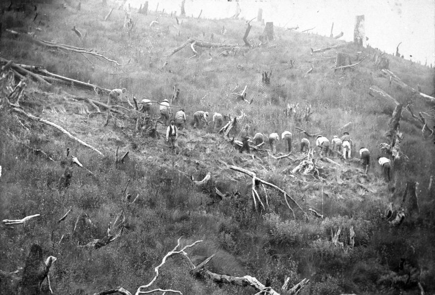 Men using hand sickles to reap grass from between felled trees and stumps. The man looking at the camera is Thomas Harrison and the site is probably his farm on Pohangina Valley West Road, about two miles south of Utuwai School.