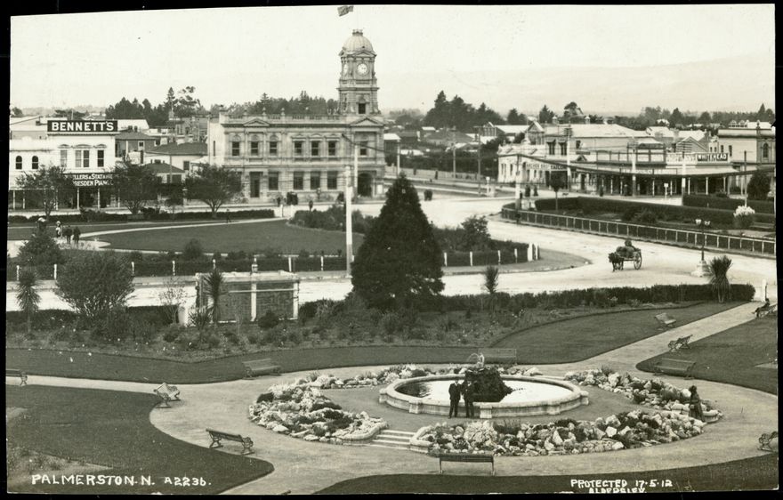The fountain in the foreground of this postcard once stood is in western quadrant of The Square, in front of where the Central Library now sits [2017]. It is shown here before the Coronation monument for Edward VII was added on top (1925). The building with the clock tower is the former Post Office. Built in 1906, it was Palmerston North’s fourth post office. The tower was removed in 1942 after the Wairarapa earthquake. In 1988, when Telecom and Postbank became separate entities, the building ceased to be the Post Office. It currently operates as a bar.