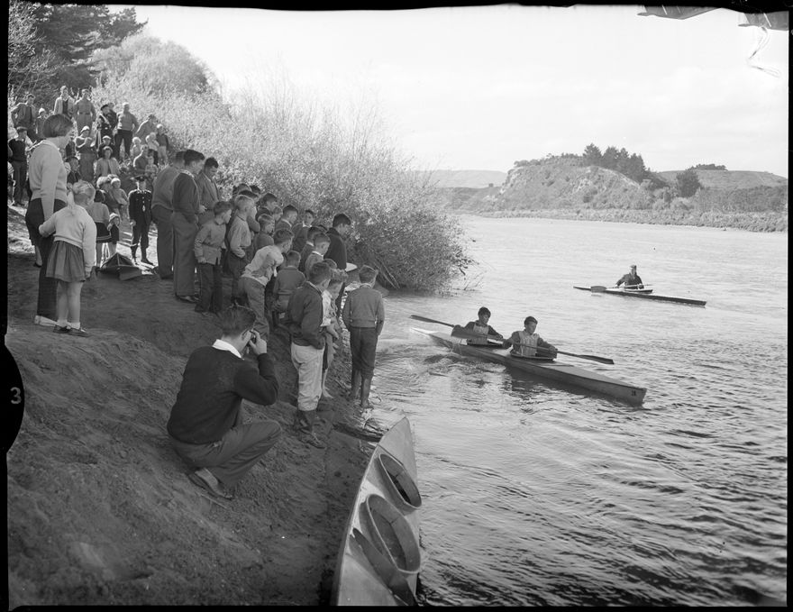 This image was taken for a story that ran in The Manawatu Evening Standard on 26 September 1960 "In the kayak are P. Markham and B. Fallaveur, who are both 14 years old and are the youngest crew taking part in the Palmerston North Boating Club's river race to Opiki on Saturday. They were photographed while setting off from the starting point at the Fitzherbert Bridge""