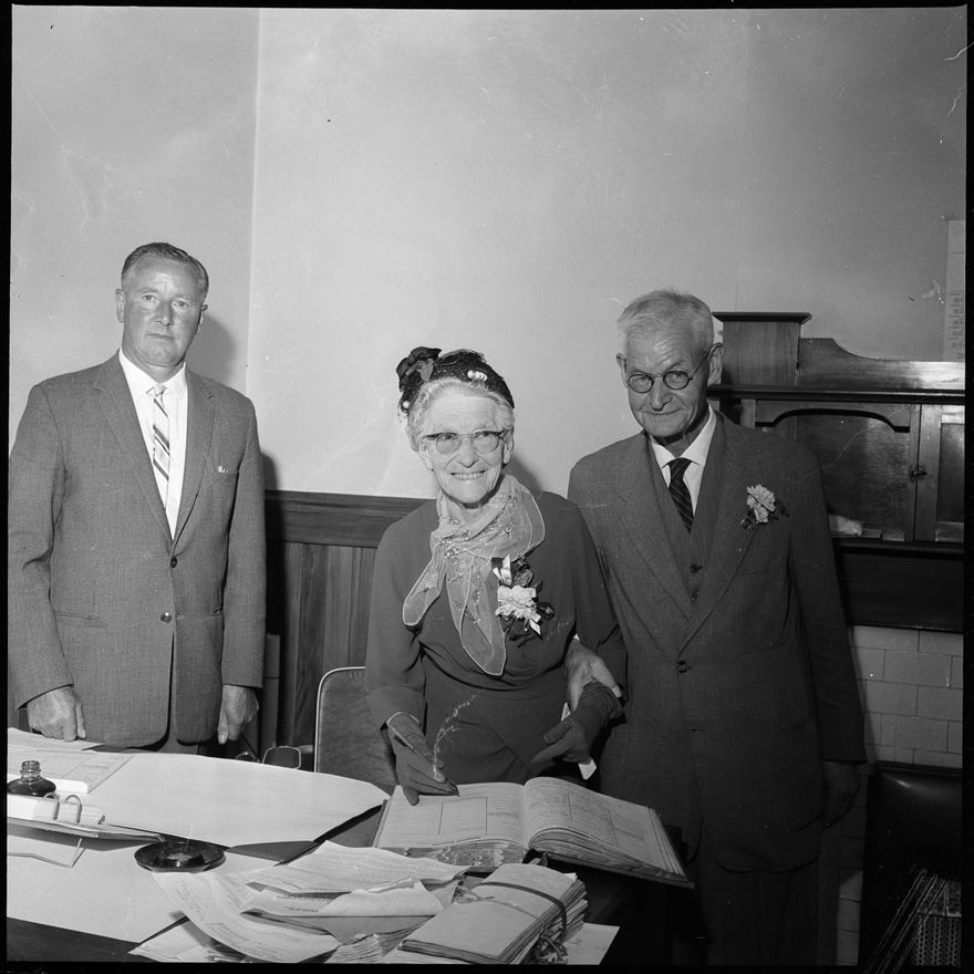 This image was taken for a story that ran in The Manawatu Evening Standard on 28 January, 1964. "Yesterday was Mrs Blanche Curtin's wedding day--but it was a wedding with a difference. For Mrs Curtin--now Mrs H. Scotton--is 91 years of age. Mr Scotten, in his seventies, is an Englishman who came to new Zealand about two years ago. The newly-married couple will live in Wanganui, which has been Mrs Scotton's home for the part eight years. They pictures shows Mr and Mrs Scotton smiling happily as they sign the register, minutes after they were married." The image was cropped to just the couple for the story. See also: 2017N_2017-20_018391