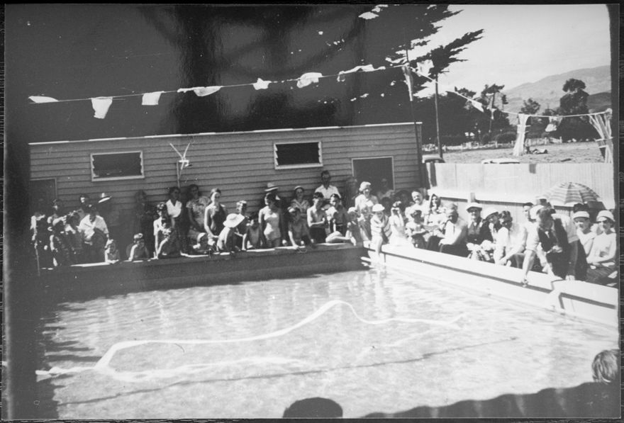 This photograph shows the baths at Ashhurst School, which were offically opened by Mr H W Brown, Chairman of the Wanganui Education Board, in February 1958. The cut ribbon can bee seen floating in the water.