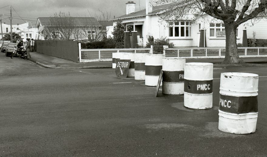 This image was taken (but not used) for a story that ran in The Manawatu Evening Standard on 01 August 1981. Barbed wire was erected around the Showgrounds and barricades blocked parts of Cuba Street in anticipation of anti-Apartheid and anti-Springbok Tour protests during the rugby match played between the Springboks and Manawatū on 1 August 1981.