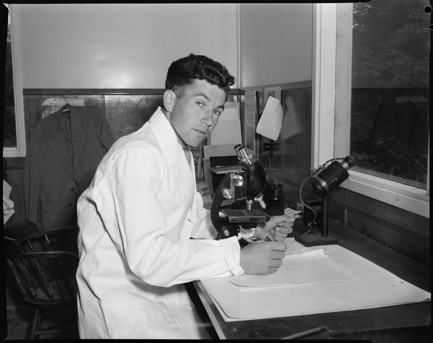 This image was taken for a story that ran in The Manawatu Evening Standard on 12 March, 1959. "Mr M. F. McDonald, M.Agr.Sc., at present assistant-research officer in sheep husbandry at Massey College, to whom a two year scholarship has been awarded. He hopes to gain his Ph.D. degree at Cambridge University, where he plans to continue his present studies in fertility in sheep. Mr McDonald gained his present degree while a student at Massey College."
