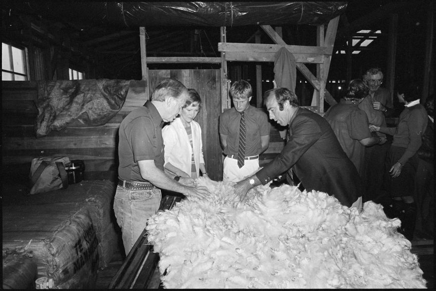 This image was taken by the Evening Standard on the 11th of February 1984 but was not published. It depicts former United States president Jimmy Carter and his wife Rosalynn visiting the hobby-farm of Richard and Barbara Walton at Aokautere. Also featured is chief Wool Board shearing instructor Robin Kidd.