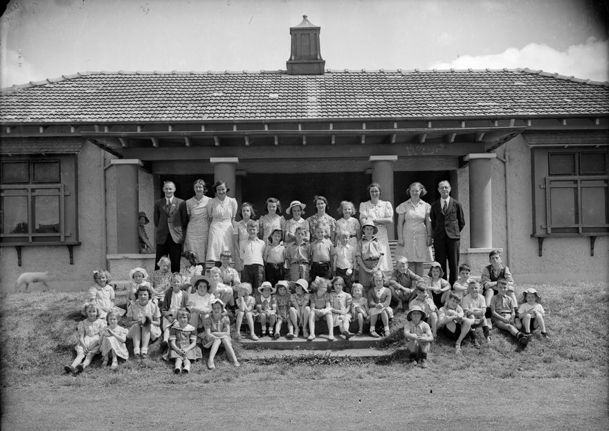 An unidentified group of children wearing sunhats, pictured with a group of adults, perhaps their carers or teachers. They are in front of the pavilion at Papaioea Park, corner of Ruahine Street and Featherston Street.