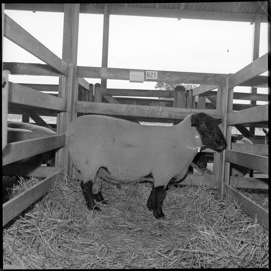 This image was taken for a story that ran in The Manawatu Evening Standard on 24 January, 1964. "First prize in the ram competition, over 21 months, at Feilding Show today, was won by this Suffolk ram, owned by Mr T. M. B. Rowe."