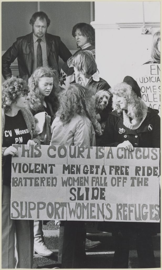 The photograph shows some protesters outside the courthouse, with their placards demanding the resignation of District Court Judge J.W.P. Watts after remarks he made when sentencing a man convicted of assaulting his de facto wife. Identified are Dr Liz Gordon (far left holding placard), who was a student at the time, and Dr Wendy Craig (far right holding placard), coordinator of Community Volunteers (who are protesting at this event). Behind them, at the top of the courthouse steps, is Peter Howse, the man to whom Judge Watts made his remarks. He was invited to attend the demonstration.