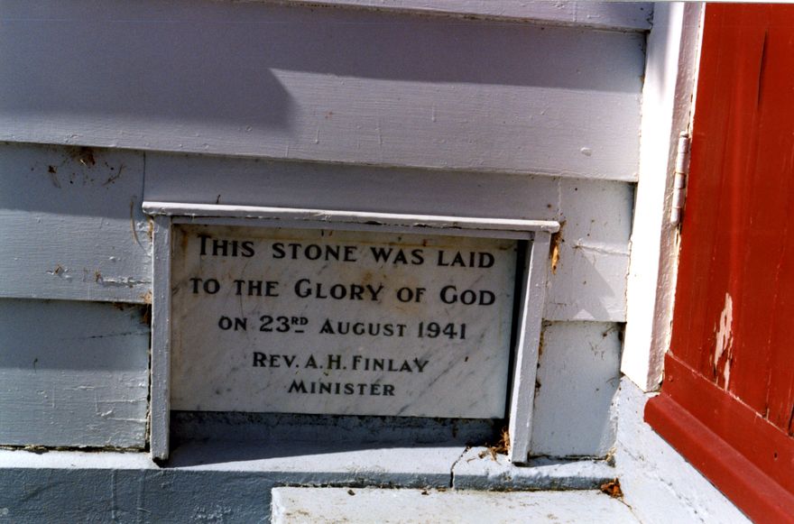 A plaque at the former Western Baptist Sunday School on Cook Street. The plaque reads: "This stone was laid to the glory of God on 23rd August 1941 Rev. A.H Finlay Minister"
