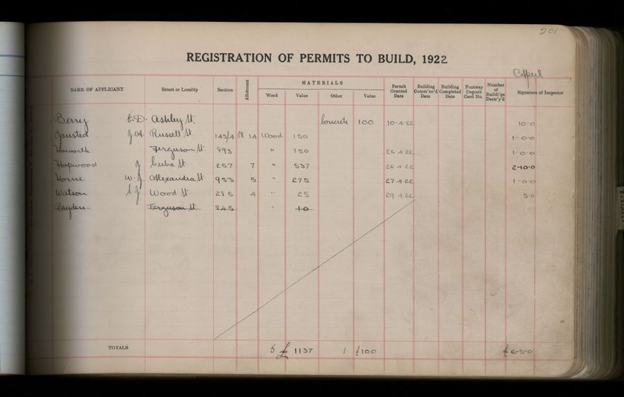Page from the third Register of Building Permits for Palmerston North Borough Council from April 1922 to March 1935.