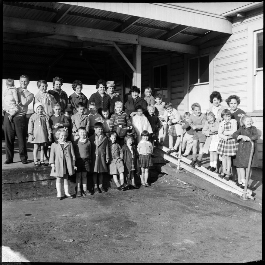 This image was taken for a story that ran in The Manawatu Evening Standard on 11 June, 1963. "Gathered on the platform of the Palmerston North railway station excitedly waiting for the railcar to take them to Woodville are these 23 young primer students from the Rangiotu School. They were accompanied by some parents their teacher, Mrs Gray, at right. Fifteen of these children have never travelled on a train in their lives."