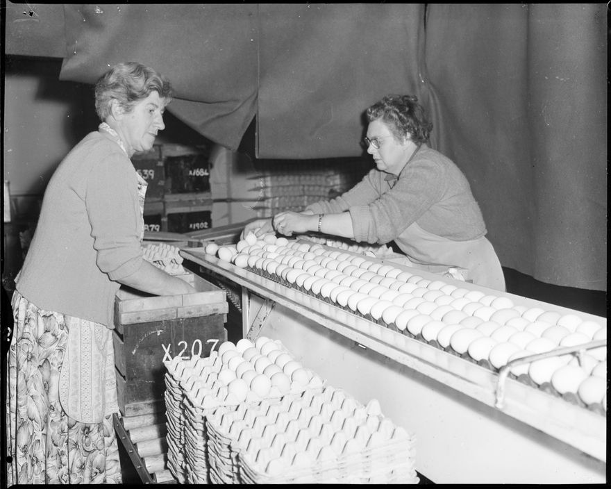 This image was taken for a story that ran in The Manawatu Evening Standard on 29 April, 1959. "At the Farm Products, Ltd., is a room in which five women sort, grade and pack eggs. This photo shows Mesdames E. Bennett, (left) and L. Brayshaw unloading eggs from a crate and putting them on a moving belt which takes the eggs over a number of strong lights. These lights shine right through the egg and enable the two women to pick out any defects. Any marks are noticed and the defective eggs discarded."