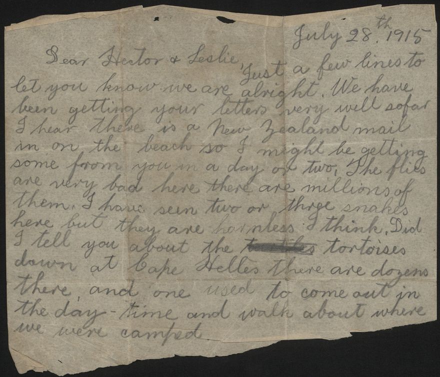 Len Argyle (1894-1915) was one of the sons of Henry and Alice Argyle of Bunnythorpe. He and his brother Pat (Percival) enlisted in the NZ Expeditionary Forces together and served in World War One. This letter, from Len to his brothers, Hector and Leslie, is presumed to be from Gallipoli. Len and Pat both died at Chunuk Bair in 1915.