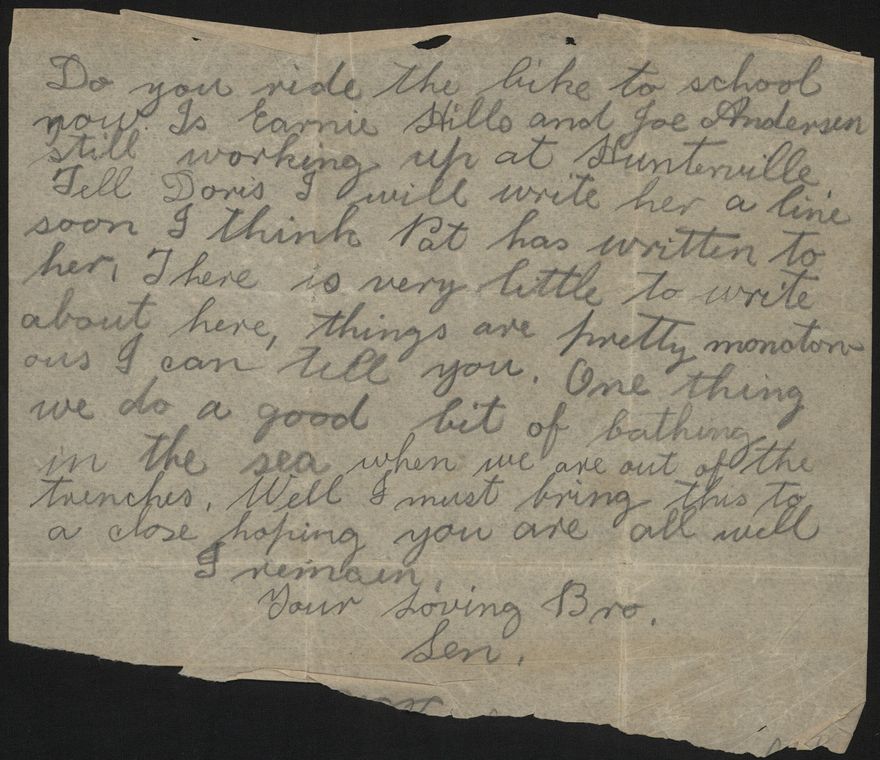 Len Argyle (1894-1915) was one of the sons of Henry and Alice Argyle of Bunnythorpe. He and his brother Pat (Percival) enlisted in the NZ Expeditionary Forces together and served in World War One. This letter, from Len to his brothers, Hector and Leslie, is presumed to be from Gallipoli. Len and Pat both died at Chunuk Bair in 1915.
