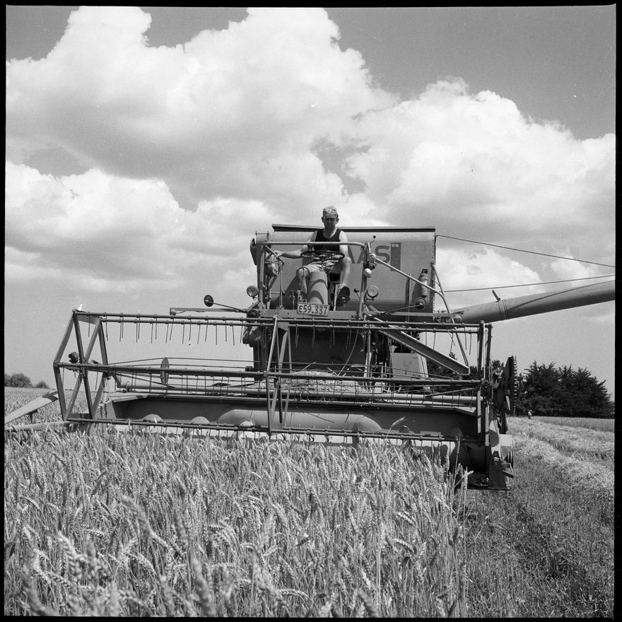 This image was taken for a story that ran in The Manawatu Evening Standard on 12 February, 1964. "... A Kairanga farmer, Mr D. R. Print, is busy reaping a 10-acre stand and is pleased with the growth results of the Australian Gemina wheat]. ... A 12ft combined harvester, is being used to cut and thresh the grain." See newspaper for the rest of the story.