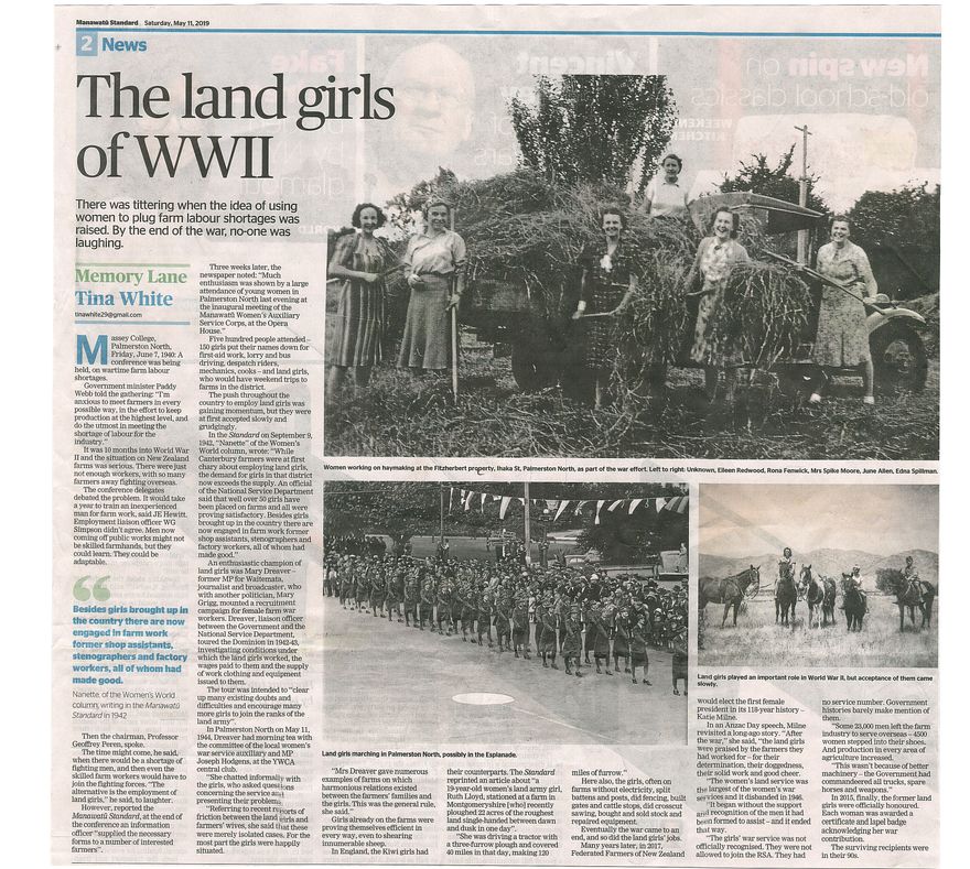 Journalist Tina White's weekly "Memory Lane" article in the Manawatū Standard. The story of the establishment of the women's land service and the Manawatū Women's Auxiliary Service Corps. It promoted farm work for women in New Zealand when men joined the fighting forces overseas in World War II.
