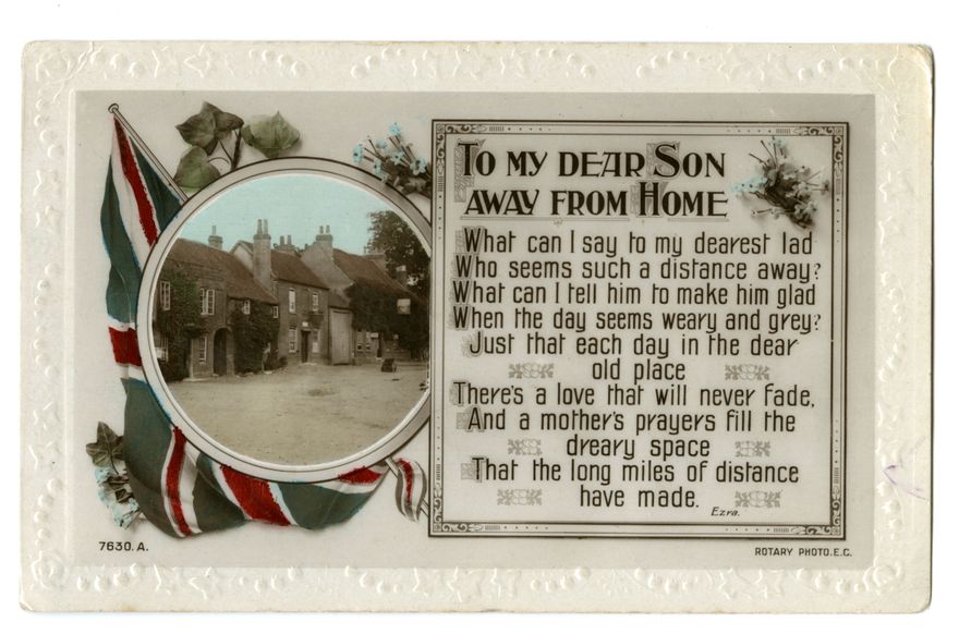 One of a series of postcards and other items related to Les Miller in World War I. Back of postcard says, "From your mother you are always in my thoughts. I trust you are not at the front yet".