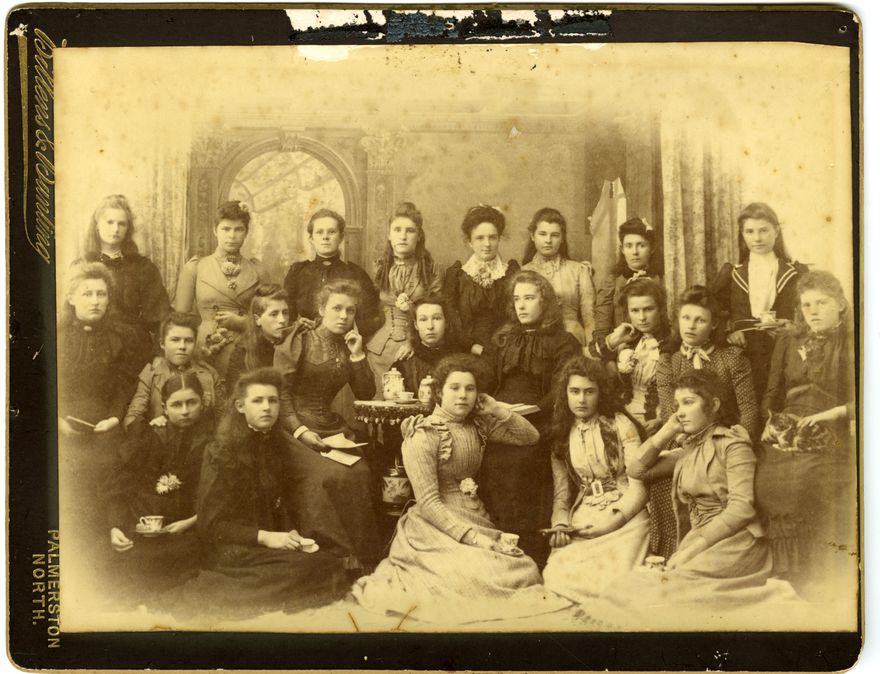 Wesleyan Young Ladies circa 1890. Top row (L-R): Jillett, P. Squire, E. Watts, unidentified, F. Squire, Squire, Rivers, unidentified. Middle row (L-R): M. Wall, K. Ellis, Jillett, Mrs. H. Howlem, E. Moore, May Carty, M. Squire, M. Rivers, unidentified. Front row (L-R): E. Keall (donors' grandmother), J. Wall, Sedgecole, Wilds, M. Collinson. P. Keall was the Reverend at the time.