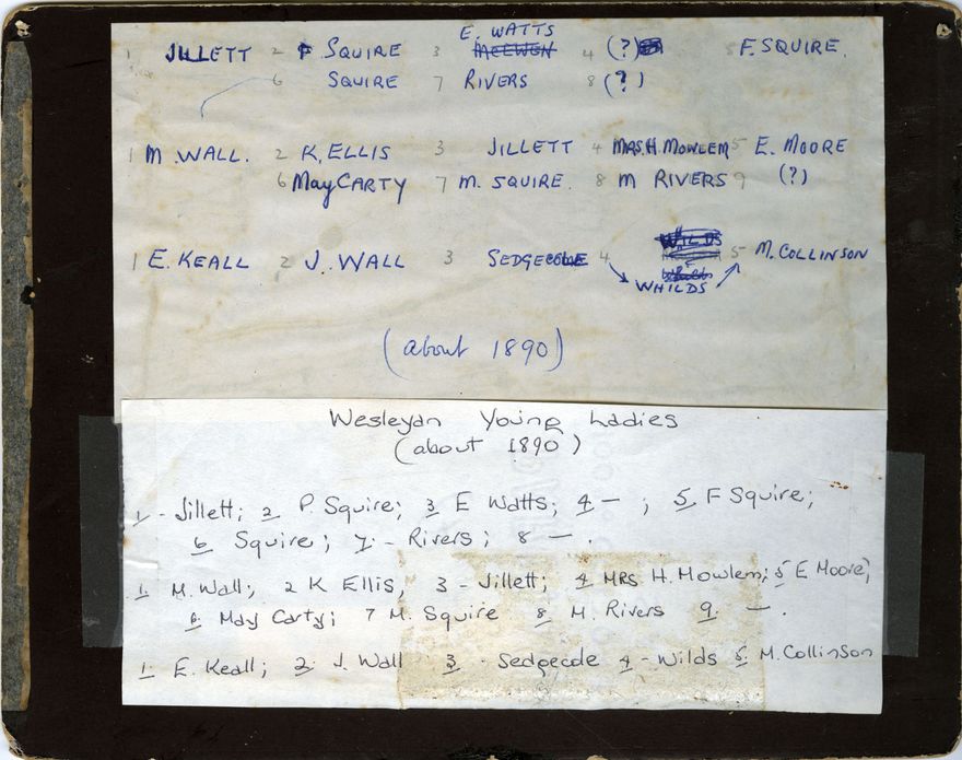 Wesleyan Young Ladies circa 1890. Top row (L-R): Jillett, P. Squire, E. Watts, unidentified, F. Squire, Squire, Rivers, unidentified. Middle row (L-R): M. Wall, K. Ellis, Jillett, Mrs. H. Howlem, E. Moore, May Carty, M. Squire, M. Rivers, unidentified. Front row (L-R): E. Keall (donors' grandmother), J. Wall, Sedgecole, Wilds, M. Collinson. P. Keall was the Reverend at the time.