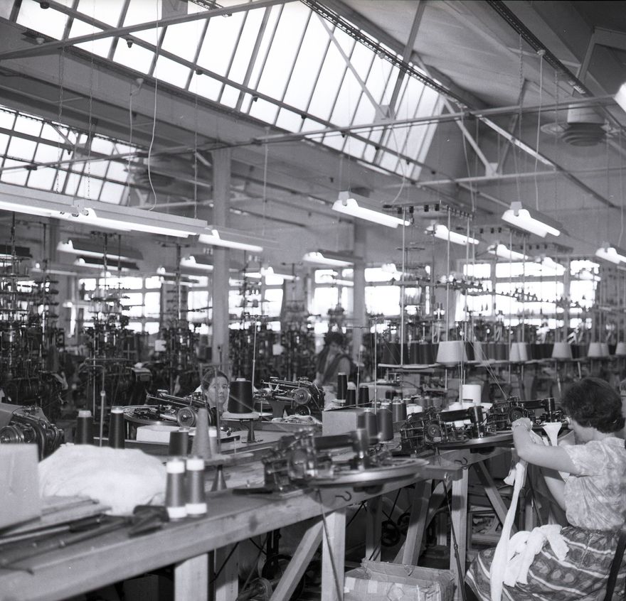 This photograph shows the interior of Jacquard Hosiery Mills Limited, including the seamstresses working at sewing machines. The Jacquard Hosiery Mills Ltd, were knitters of underwear and outerwear, that went under the brand name 'Jacquard. The mill was situated at 601 Featherston Street, Palmerston North. Published in the Manawatu Evening Standard 12 February 1968.In the 1967 Palmerston North phone book the factory is listed as Jacquard Hosiery Mills Limited at 601 Featherston Street. Personnel included General Manager V Kraak, Manager W.V. Hobbs and Secretary M F Ryder.