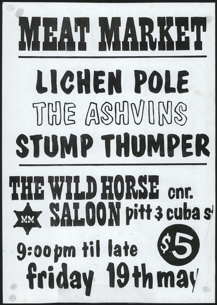 Meat Market. Lichen Pole. The Ashvins. Stump Thumper. The Wild Horse Saloon cnr. Pitt & Cuba Street. 9:00 pm til late. friday 19th may. $5. Part of a collection of posters that were displayed at The Stomach, Lombard Street, venue for Creative Sounds Society Incorporated.